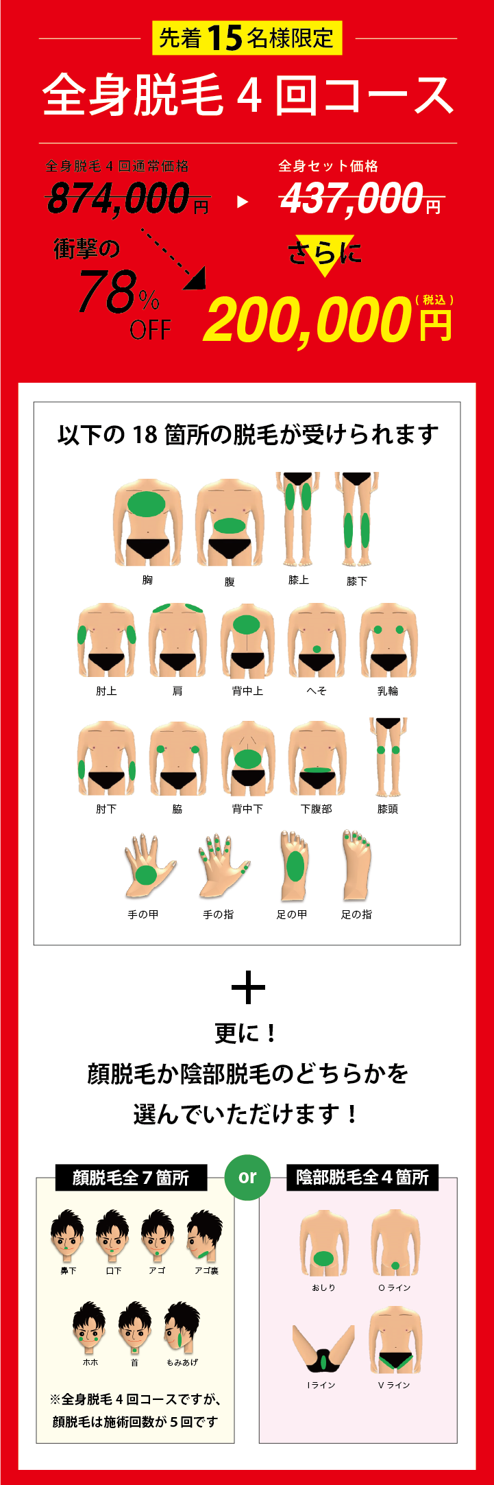 体脱毛全18箇所の脱毛を4回受けていただけます。さらにヒゲ7箇所の脱毛5回か陰部全4箇所の脱毛4回を選んでいただき、そのどちらかの脱毛を受けていただけます。