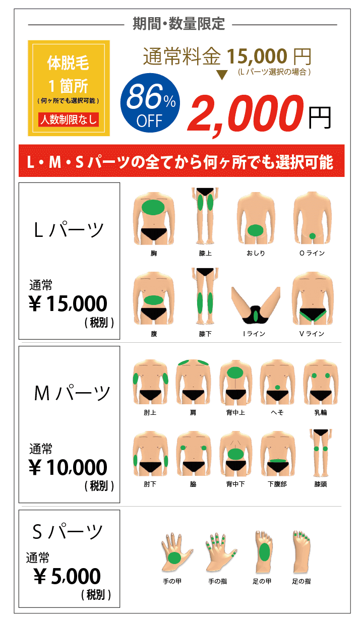 - 体Lパーツ:通常15,000円(税別)→2,000円(税別)